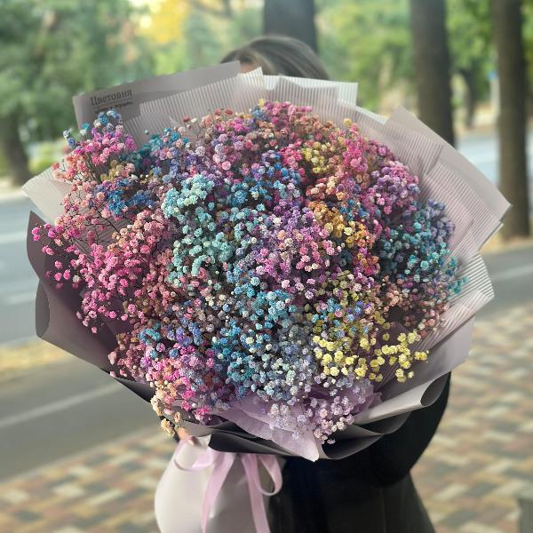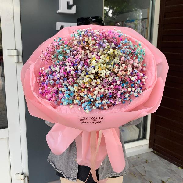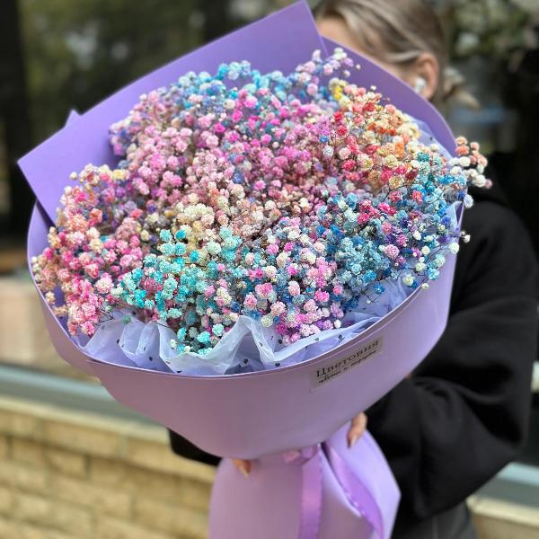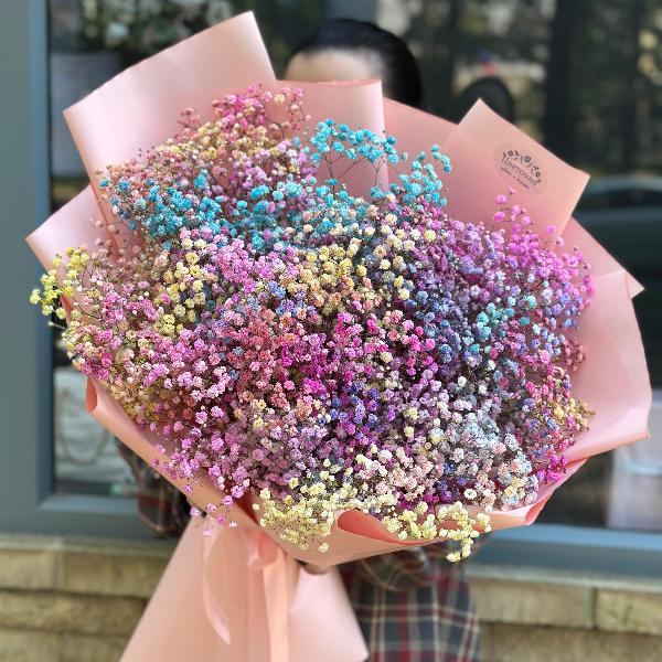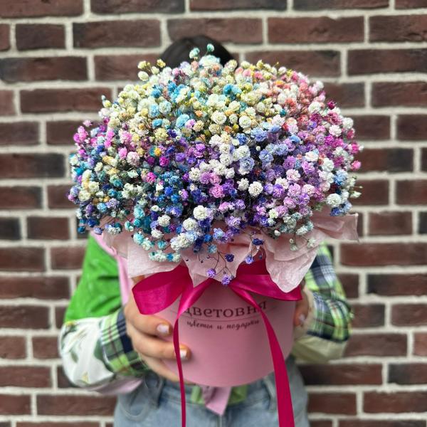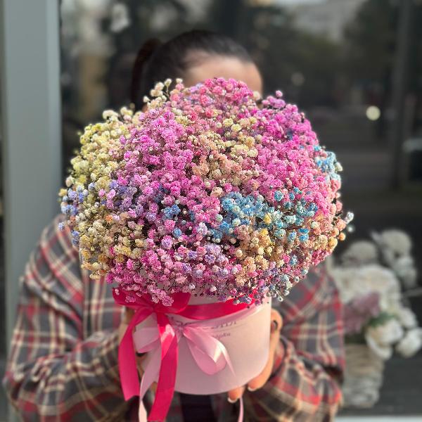 Гипсофила представлена различными сортами: белая гипсофила, цветы в розовых или кремовых оттенках, даже радужная гипсофила. Каждый сорт в нашем каталоге отличается своей уникальной формой и размером цветков. Вы можете заказать лаконичный нежный букет или гипсофилу в шляпной коробке - популярный вариант на день рождения и другие мероприятия.